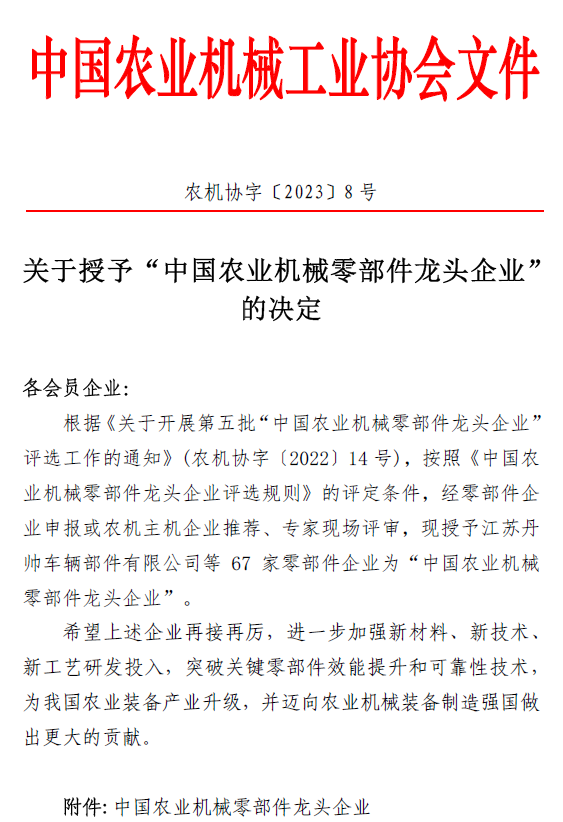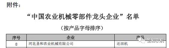 2023年3月9日,中國農業機械工業協會發布關于授予“中國農業機械零部件龍頭企業”的決定(農機協字[2023]8號文件),河北圣和農業機械有限公司位列榜單,以優秀的配套還田機零部件而著稱。