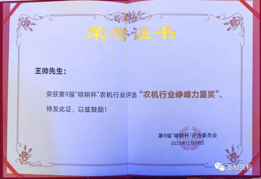 頒獎詞是評委會對王新芳董事長為農(nóng)機行業(yè)發(fā)展所做貢獻的高度概括和總結;獲此殊榮,作為中國農(nóng)機行業(yè)的杰出代表,是行業(yè)對他卓越貢獻的肯定。功成名遂,值得我們學習和敬仰。 王新芳董事長的兒子王帥榮獲本屆精耕杯“農(nóng)機行業(yè)崢嶸力量獎”。評委會頒獎詞為:他虛心好學,踏實肯干,他長期工作在生產(chǎn)一線,勤奮鉆研現(xiàn)代工藝技術,主持攻克一系列工藝技術難題。他牽頭完成的旋耕機主要部件應用機器人焊接技術攻關,實現(xiàn)了旋耕機焊接工藝的技術突破,使公司生產(chǎn)效率大幅提升,產(chǎn)品質量更加穩(wěn)定,為圣和公司跨越發(fā)展做出了突出貢獻。