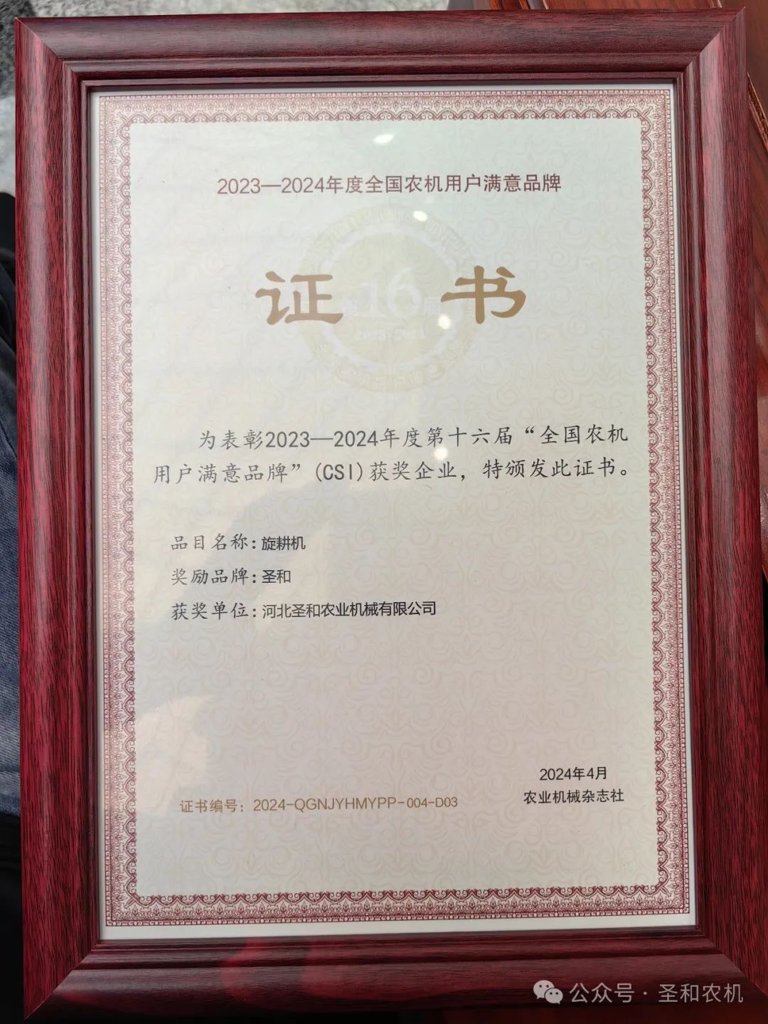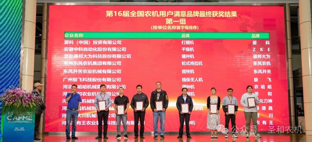 2024年4月27日,“2024 第二屆農(nóng)機(jī)品牌大會(huì)”在浙江永康隆重召開(kāi)。在“2023—2024年度第16屆全國(guó)農(nóng)機(jī)用戶滿意品牌頒獎(jiǎng)儀式”上,圣和牌旋耕機(jī)再次蟬聯(lián)第十六屆全國(guó)農(nóng)機(jī)用戶滿意品牌大獎(jiǎng)。