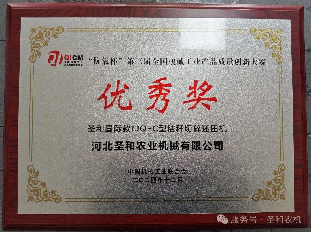 “2024年全國(guó)機(jī)械工業(yè)高質(zhì)量發(fā)展大會(huì)”于12月10日在杭州盛大開(kāi)幕。從大會(huì)同期舉辦的“杭氧杯”第三屆全國(guó)機(jī)械工業(yè)產(chǎn)品質(zhì)量創(chuàng)新大賽頒獎(jiǎng)活動(dòng)上喜報(bào)傳來(lái),河北圣和農(nóng)業(yè)機(jī)械有限公司的“圣和國(guó)際款1JQ-C型秸稈切碎還田機(jī)”在眾多評(píng)選項(xiàng)目中脫穎而出,喜獲大賽優(yōu)秀獎(jiǎng)。