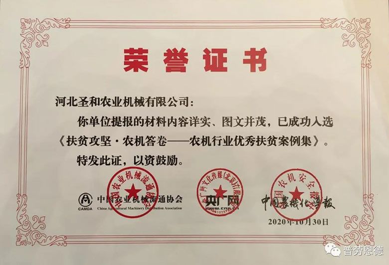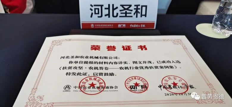 《農(nóng)機行業(yè)優(yōu)秀扶貧案例集》,入選案例榮譽證書頒發(fā)儀式同期舉辦!圣和是唯一入選的河北生產(chǎn)企業(yè)!