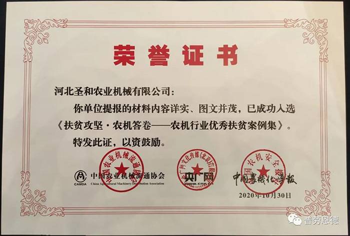 《農(nóng)機(jī)行業(yè)優(yōu)秀扶貧案例集》入選案例榮譽(yù)證書(shū)頒發(fā)儀式同期舉辦!河北圣和是唯一入選的河北生產(chǎn)企業(yè)!