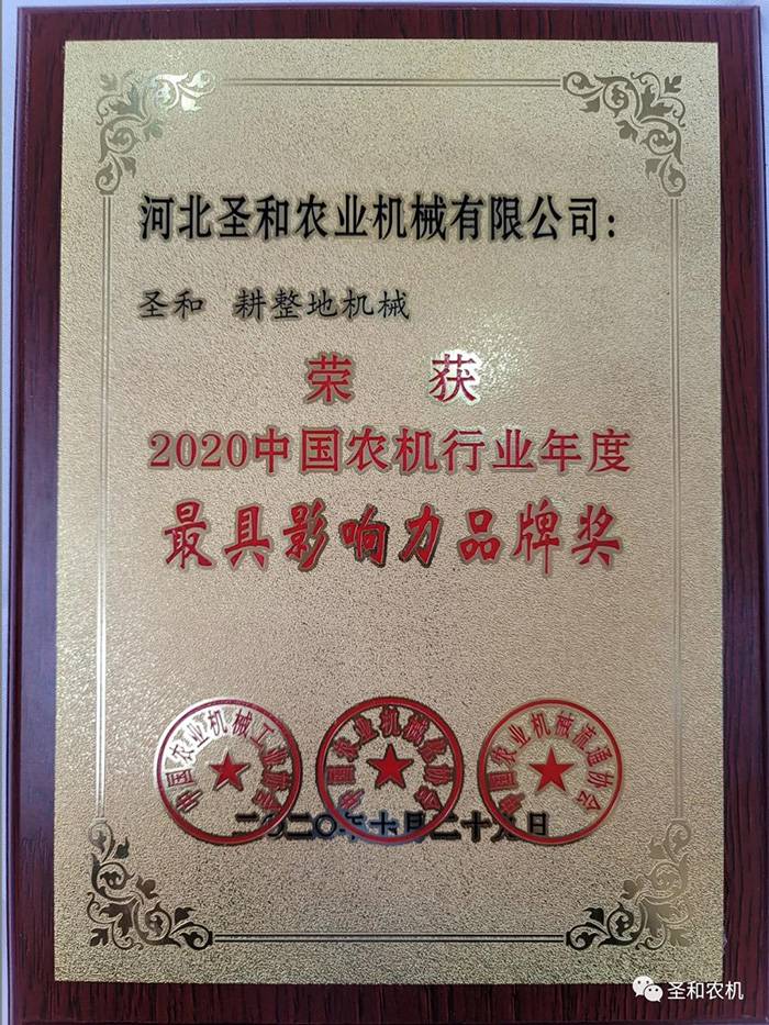 11月13日,“2020中國(guó)農(nóng)機(jī)行業(yè)年度大獎(jiǎng)?lì)C獎(jiǎng)儀式”在青島世界博覽城國(guó)際會(huì)展中心舉辦,河北圣和農(nóng)業(yè)機(jī)械有限公司“圣和”品牌榮獲最具影響力品牌獎(jiǎng),也是全國(guó)農(nóng)機(jī)行業(yè)耕整地機(jī)械類唯一獲獎(jiǎng)企業(yè)品牌。
